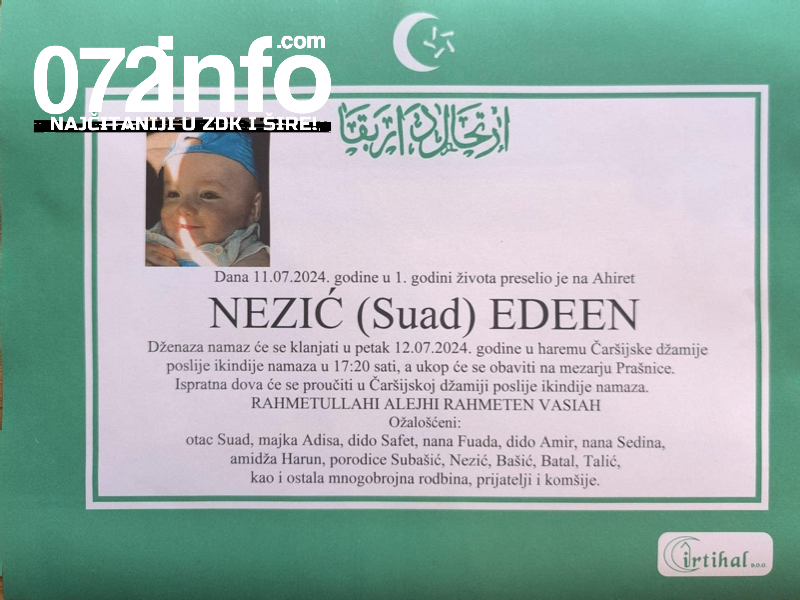 Zenica je obavijena tugom nakon vijesti da ih je zauvijek napustio maleni Edeen Nezić, piše “072info”.