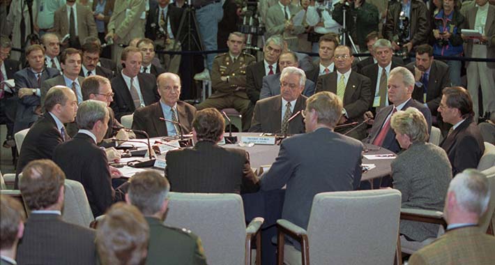 Slobodan Milošević, Alija Izetbegović i Franjo Tuđman na potpisivanju Mirovnog sporazuma. Skroz desno sjedi američki pregovarač Warren Christopher