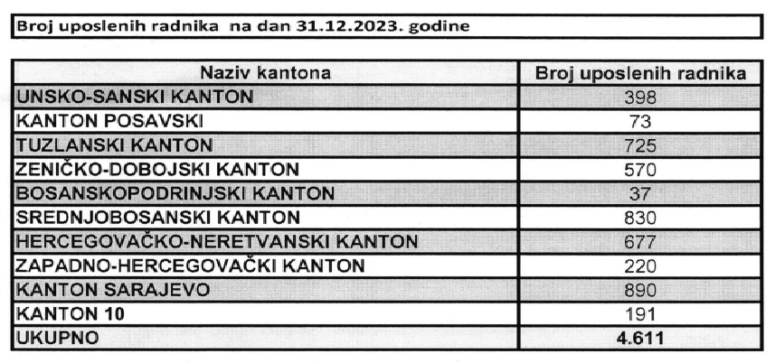 Kantoni sa najmanje zaposlenih u ovom sektoru bili su Bosansko-podrinjski sa 37 radnika i Posavski sa 73.