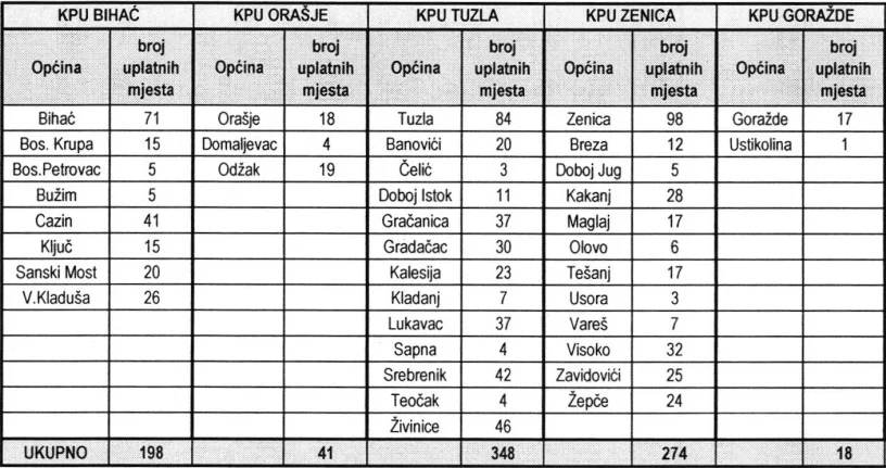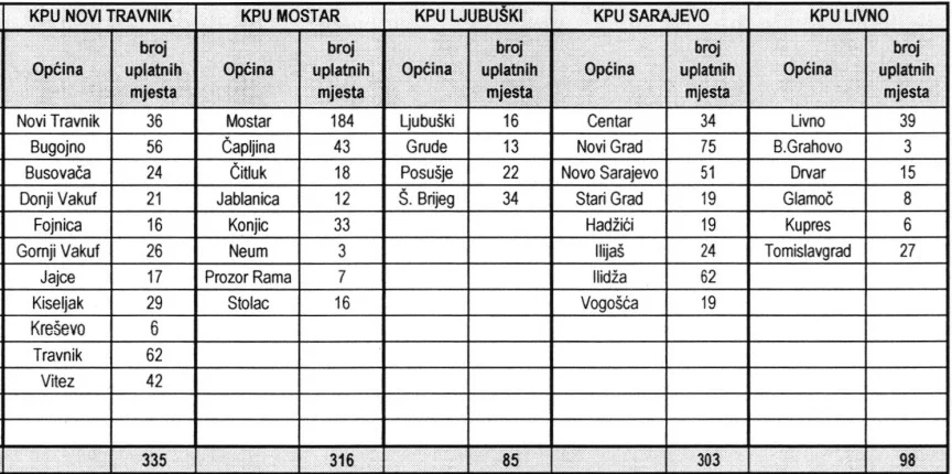 Najviše uplatnih mjesta ima Tuzlanski kanton (TK) – 348. Slijedi Srednjobosanski (SBK) sa 335, Hercegovačko-neretvanski (HNK) 316, Kanton Sarajevo (KS) 303, Zeničko-dobojski (ZDK) 274, Unsko-sanski (USK) 198, Livanjski (Kanton 10) 98, Zapadnohercegovački (ZHK) 85, Posavski 41 i Bosansko-podrinjski kanton Goražde (BPK) 18.