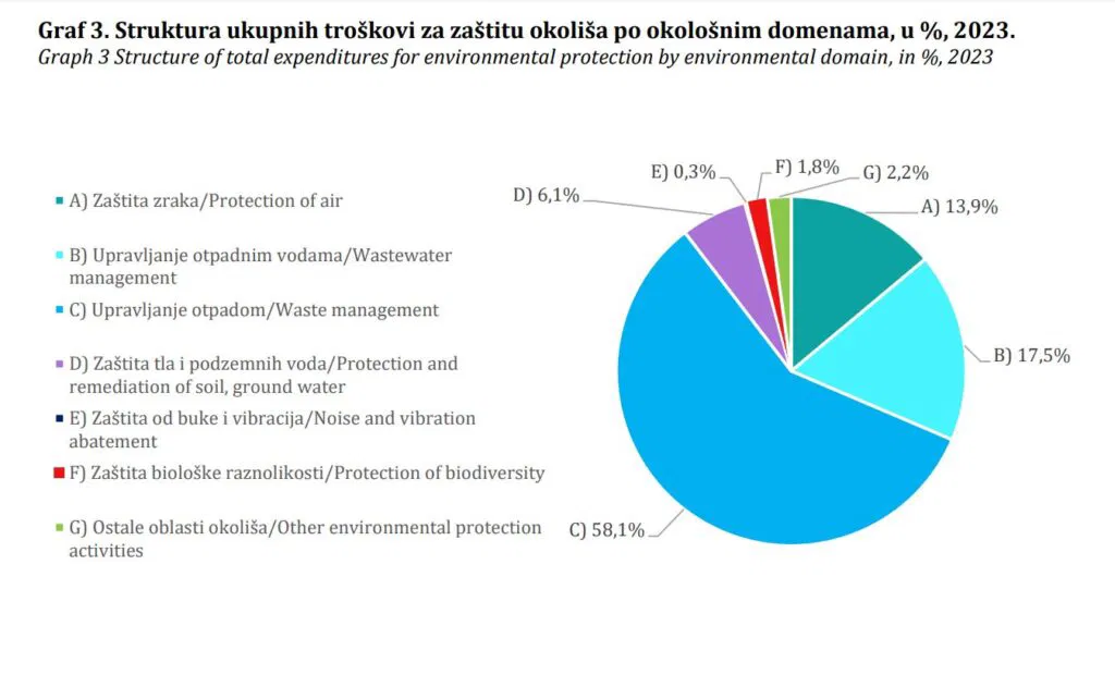 Od ukupnih troškova za zaštitu okoliša u prošloj godini, 21,5 posto je utrošeno na investicije u zaštitu okoliša dok je 78,5 sredstava utrošeno na usluge zaštite okoliša.