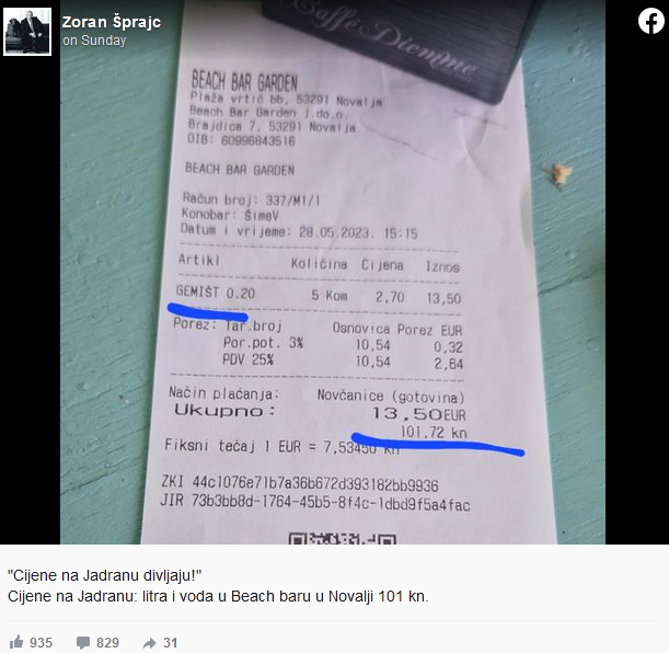 – „Cijene na Jadranu divljaju“! Cijene na Jadranu: litra i voda u Beach baru u Novalji 101 kn, napisao je Šprajc pored računa za 5 gemišta, koje je platio 13.50 eura. Htio je tako kazati kako to po njemu nije skupo, no našlo se onih kojima je i to bilo skupo.
