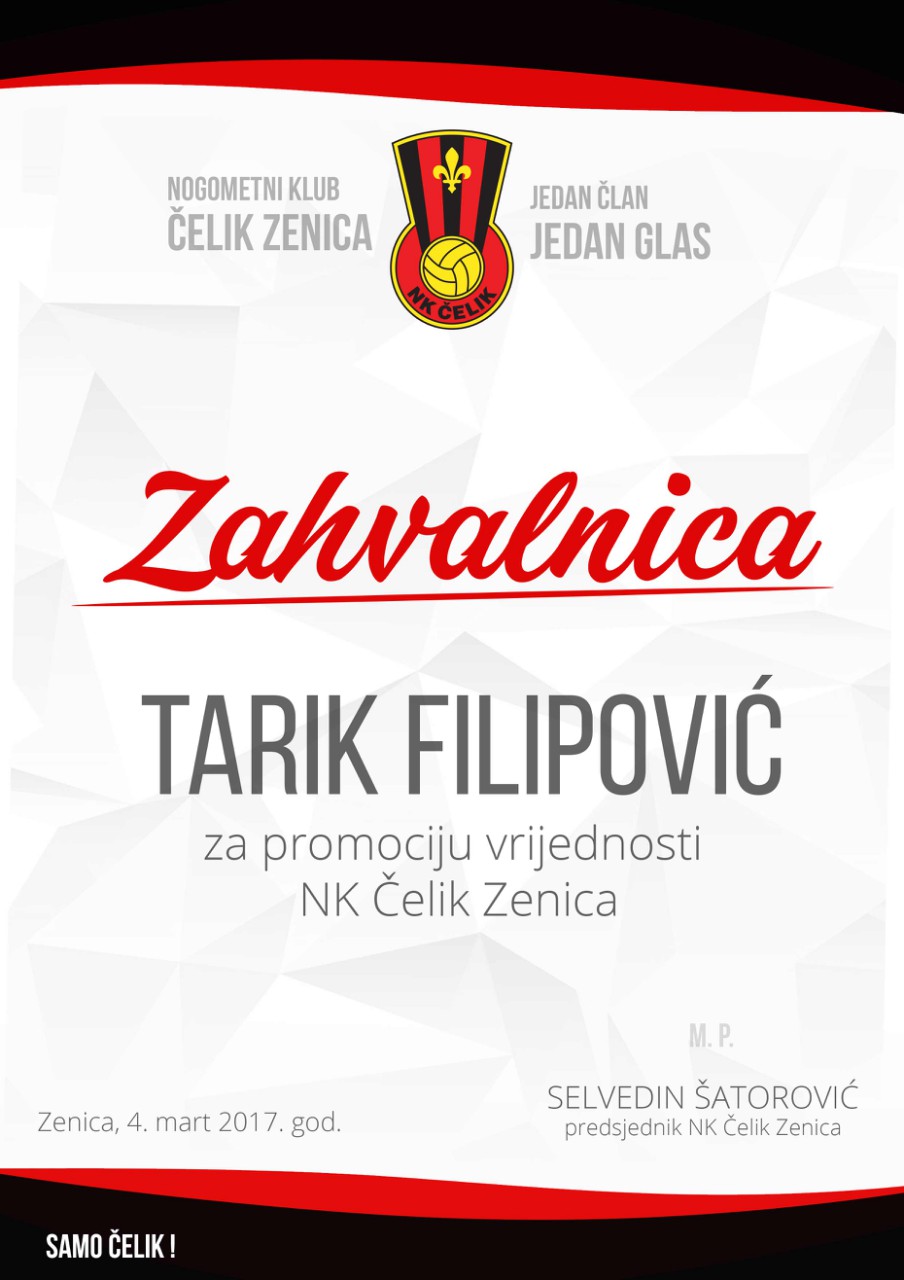 Stoga, nije zaslužio ništa manje od ovakvog priznanja gdje mu je pored zahvalnice uručen i aktuelni dres našeg kluba sa brojem 72 koji predstavlja godinu njegovog rođenja u našem gradu kao i tako poznati kod 072 – Zenica i Čelik zauvijek! Očekujemo gospodina Filipovića da bude što češći gost u svom gradu, da posjećuje utakmice crno-crvenog ponosa grada kao i da se što prije pridruži rastućem članstvu našeg kluba – trenutno nas je 632!