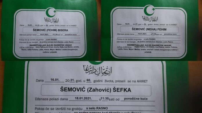 Nastradalim osobama porodice Šemović, Šefka, Fehim i Bisera dženaza polazi sutra u 11:30 isored oporodične kuće u kojoj se i desila tragedija, a pokop će se izvršiti na groblju u selu Rasno.