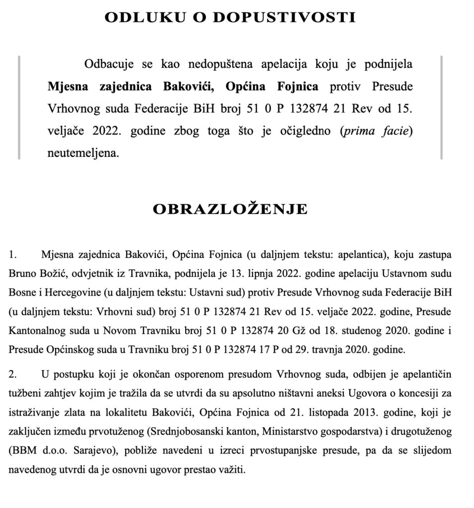 Priča oko istraživanju zlata na području Bakovića kod Fojnice koja traje skoro 15 godina doživjela je svoj epilog Ustavnom sudu BiH.