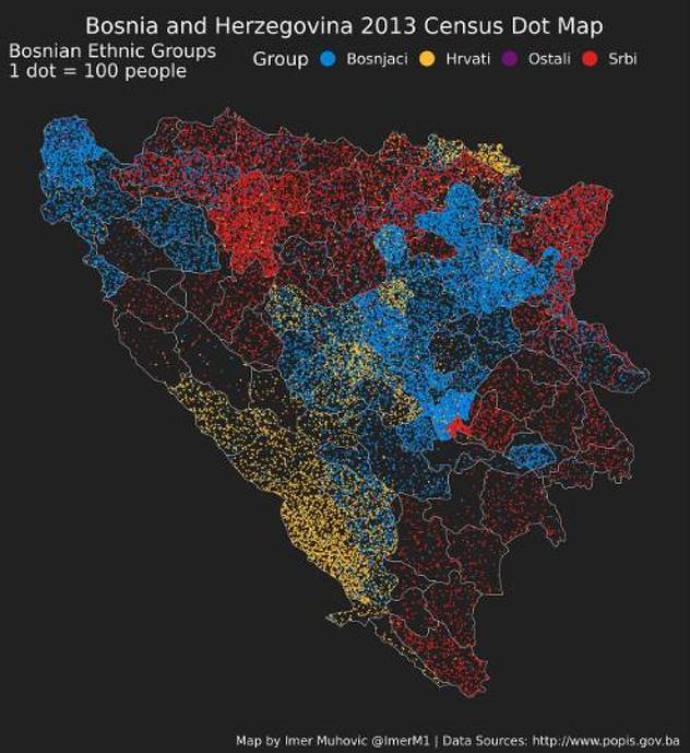 “Vjerujem da glasači imaju pravo da zahtijevaju jasan i precizan pregled glasova pa da sami mogu doći do nekih zaključaka bez utjecaja dežurnih komentatora. Doduše, kartografski prikazi koje sam koristio i nisu previše informativni, jer ta vrsta karte (choropleth) ne prikazuje gustoću naseljenosti. Po mojoj karti predsjedničke utrke bi se reklo da su Dragan Čović i Milorad Dodik apsolutni pobjednici izbora, jer je ogroman dio karte u njihovim bojama, ali ne prikazuje da su najbolje rezultate ostvarili u najnenaseljenijim regijama BiH, kao što bismo, recimo, mogli vidjeti na ovoj tačkastoj karti koju sam napravio prije nekoliko mjeseci”, ističe Muhović.