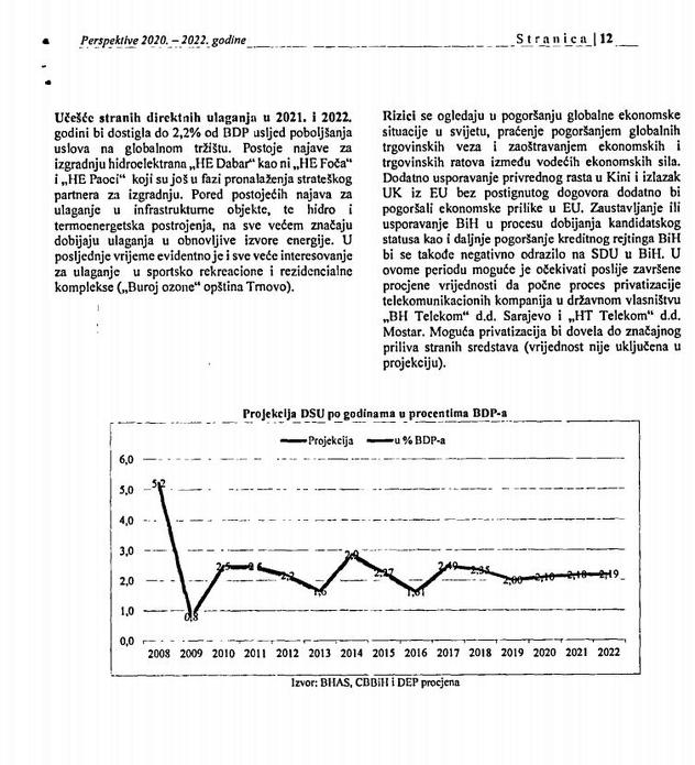 “Rizici se ogledaju u pogoršanju globalne ekonomske situacije u svijetu, praćenju pogoršanja globalnih trgovinskih veza i zaoštravanju ekonomskih i trgovinskih ratova između vodećih ekonomskih sila. Dodatno usporavanje privrednog rasta u Kini i izlazak UK iz EU bez postignutog dogovora dodatno bi pogoršali ekonomske prilike u EU. Zaustavljanje ili usporavanje BiH u procesu dobijanja kandidatskog statusa, kao i daljnje pogoršanje kreditnog rejtinga BiH bi se također negativno odrazilo na SDU u BiH. U ovom periodu moguće је očekivati poslije završene procjene vrijednosti da počne proces privatizacije telekomunikacionih kompanija u državnom vlasništvu ВН Telecoma d.d. Sarajevo i HT Telekoma d.d. Mostar. Moguća privatizacija bi dovela do značajnog priliva stranih sredstava (vrijednost nije uključena u projekciju)”, navodi se u izvještaju.