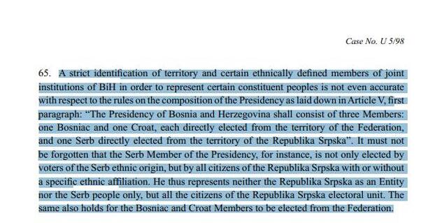 U paragrafu 65. Ustavni sud kaže: “Striktna identifikacija teritorije i određenih etnički definisanih članova institucija Bosne i Hercegovine, s ciljem predstavljanja određenih konstitutivnih naroda, nije čak ni usklađena s pravilima o kompoziciji Predsjedništva BiH, kako su naznačena u članu 5, paragraf 1.”