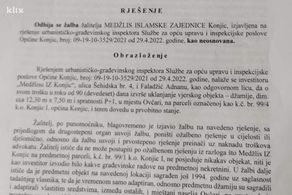 “Islamska zajednica je 1994. godine ušla u posjed uz odobrenje Općine Konjic koja je čak jednu firmu stavila na raspolaganje da se prostor pripremi za organizaciju vjerskog života u tom mjestu. Imovinsko-pravni odnosi su se pokušali riješiti 1999. godine da bi posjed prešao u vlasništvo vjerske zajednice, ali je tada ustanovljeno da je zemlja na ŽGP-u. Oni su nas uputili na Općinu da riješimo to pitanje, gdje nam je rečeno da prostor koristimo i da će se u međuvremenu to riješiti. Tako da smo koristili cijelo vrijeme i nikad niko nije postavio to pitanje. Ali 2017. godine je taj objekat došao u stanje u kojem se nije mogao koristi i mi smo pristupili renoviranju. Tada smo dobili urbanističku saglasnost u kojoj istina stoji da trebamo pribaviti i građevinsku dozvolu, a do tada riješiti imovinsko-pravne odnose. Opet smo pokušali to riješiti u kabinetu tadašnjeg načelnika Konjica, koji nam je kazao da se to gradi, čak i ŽGP nije imao ništa protiv. Tada se pojavio i donator i mi smo sagradili džamiju na istim gabaritima na kojima je bio i taj objekat, s tim da je dodana munara koje nije bilo”, priča glavni imam iz Konjica za Klix.ba pokušavajući razjasniti zamršenu priču.