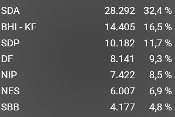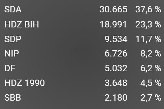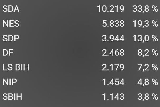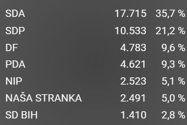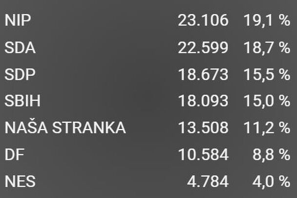 Tako na osnovu nešto manje od 50 posto sabranih glasova za Kanton Sarajevo vidljivo je da SDA i NiP vode tijesnu borbu i vrlo izvjesno je d abi mogli imati isti broj zastupnik (po procjena po 7 ili po 8 zastupnika).