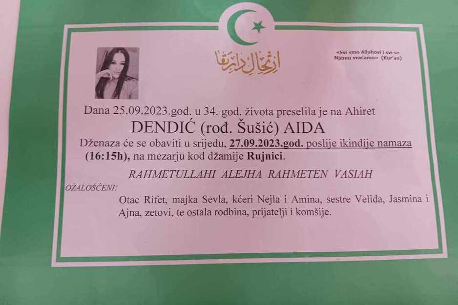 Ukop i dženaza će biti obavjeni na mezarju kod džamije Rujnici u Zavidovićima u 16:15 sati poslije ikindije-namaza.