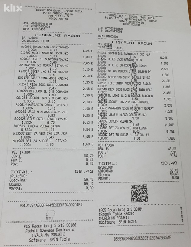 U nastavku možete pogledati priložene račune s napomenom da se prilikom druge kupovine u korpi nije nalazilo svježe pile te je prva kupovina uključivala 15, a druga 14 artikala.