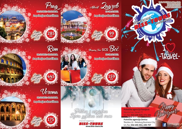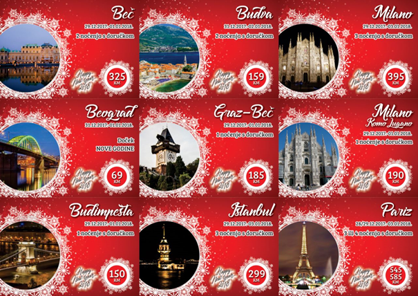 Budva, Beč, Pariz, Milano, Prag, Rim, Verona samo su neke od destinacija gdje možete uživati u pravoj novogodišnjoj čaroliji. Želimo Vam da u novu godinu zakoračite putovanjem koje se pamti uz Biss-tours.