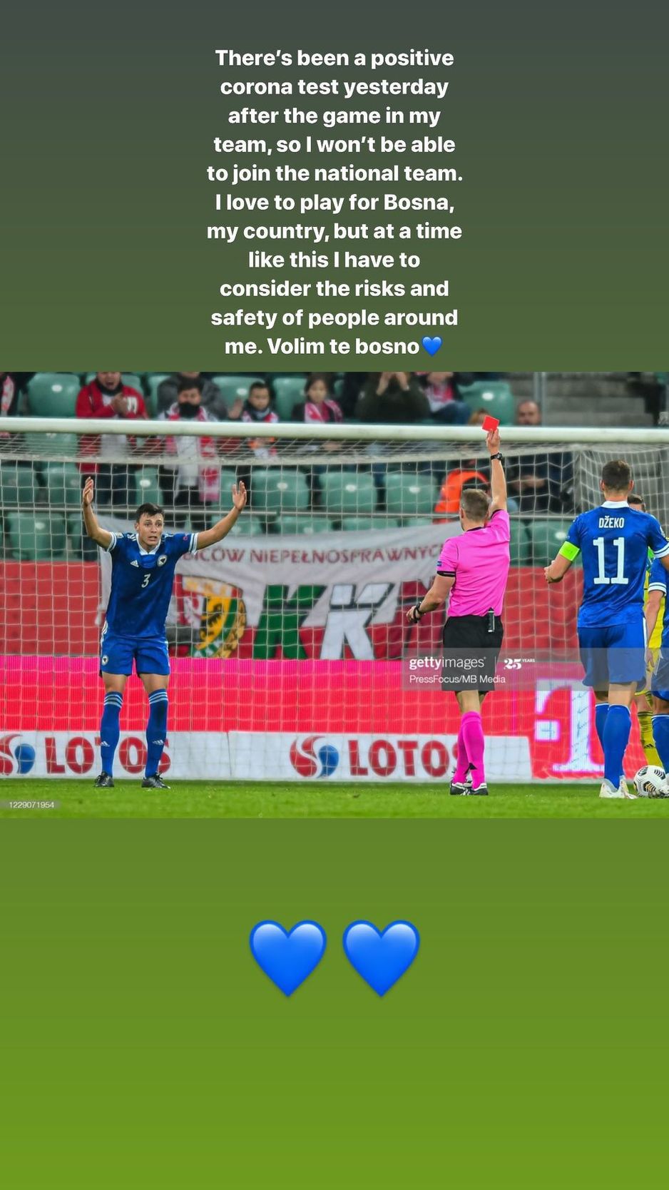“Nakon jučerašnje utakmice moje ekipe pojavio se jedan pozitivan test, tako da se neću moći priključiti reprezentaciji. Volim igrati za moju zemlju Bosnu, ali u ovom trenutku moram voditi računa o riziku i sigurnosti ljudi oko mene. Volim te Bosno”, poručio je Ahmedhodžić.