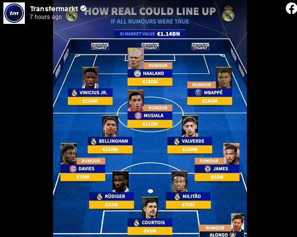 Specijalizirani portal za fudbalske statistike “Transfermarkt” sastavio je ekipu Reala koja bi bila strah i trepet ukoliko bi se sve glasine potvrdile i svi željeni igrači stigli na Bernabeu.