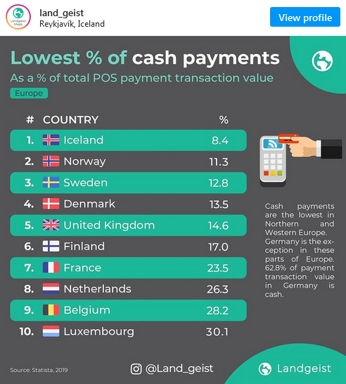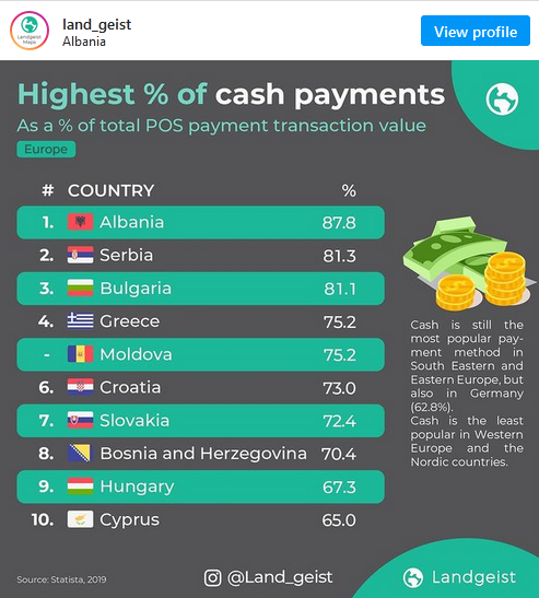 Instagram profil Landgeist često dijeli interesantne slike i mape, a sada su podijelili listu zemalja čiji građani najviše koriste gotovinu u svojim transkacijama.