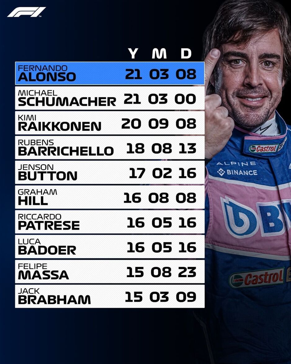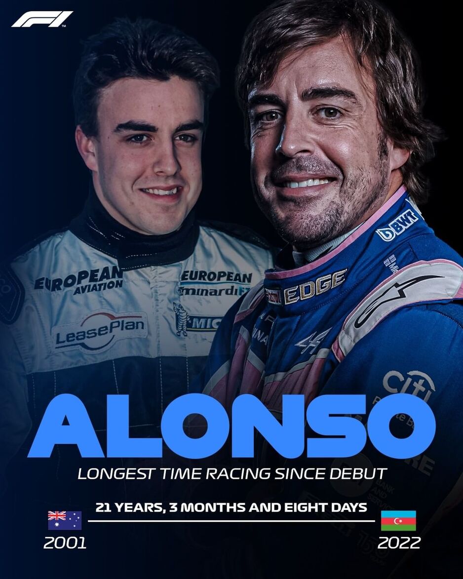 Španac ima 40 godina, ali je još uvijek sjajan i veoma konkurentan u bolidu Alpinea. Alonso vozi utrke duže od 20 godina, a nakon trkačkog vikenda u Azerbejdžanu, odnosno kvalifikacija voženih u subotu, postao je vozač koji se najduže takmiči u historiji Formule 1.