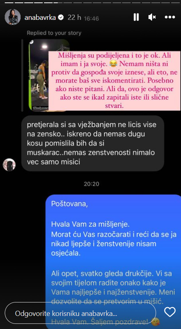 “Pretjerala si s vježbanjem, ne ličiš na žensko. Iskreno, da nemaš dugu kosu pomislila bih da si muškarac. Nemaš ženstvenosti nimalo, već samo mišići”, komentar je koji je Ana podijelila na svom Instagram profilu.