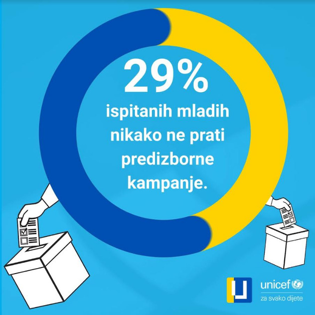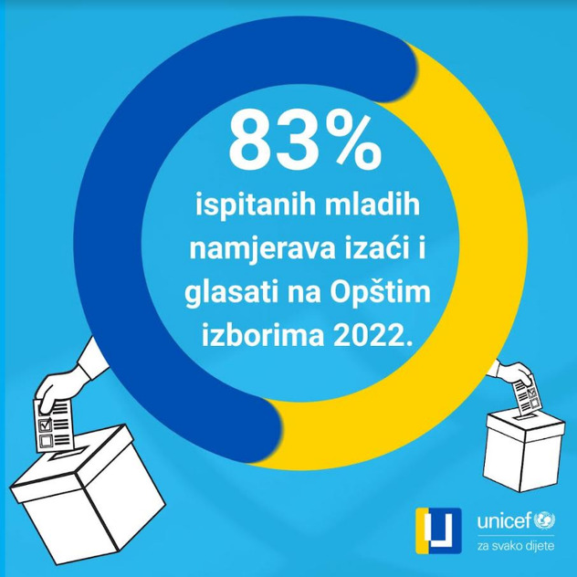 Prema rezultatima ankete UNICEF-ove platforme za podršku društvenom aktivizmu mladih U-Report BiH, 83 posto mladih planira izaći i glasati na Općim izborima 2. oktobra, 14 posto nema namjeru, a tri posto ispitanih kažu da još nisu odlučili.