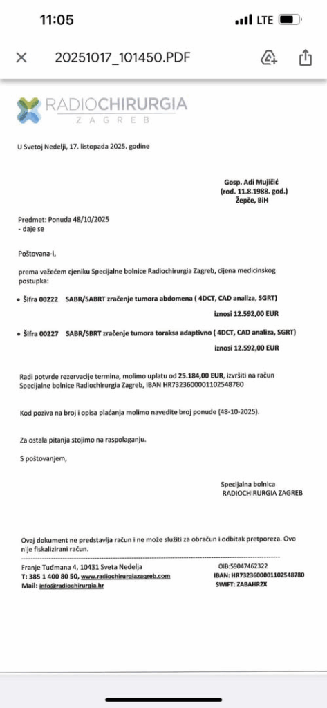 Pišem vam u suzama i sa ogromnom tugom, ali i sa nadom koja je još uvijek u mom srcu. Nažalost, dijagnosticiran mi je tumor rektuma sa metastazama na jetri i plućima, i pred sobom imam tešku borbu za život. Dosadašnja teška terapija nije dala rezultate, ali doktori iz Zagreba su mi rekli da postoji šansa, ali kako bi to postalo stvarnost, potrebna mi je pomoć koju više ne može osigurati moja porodica i ja.