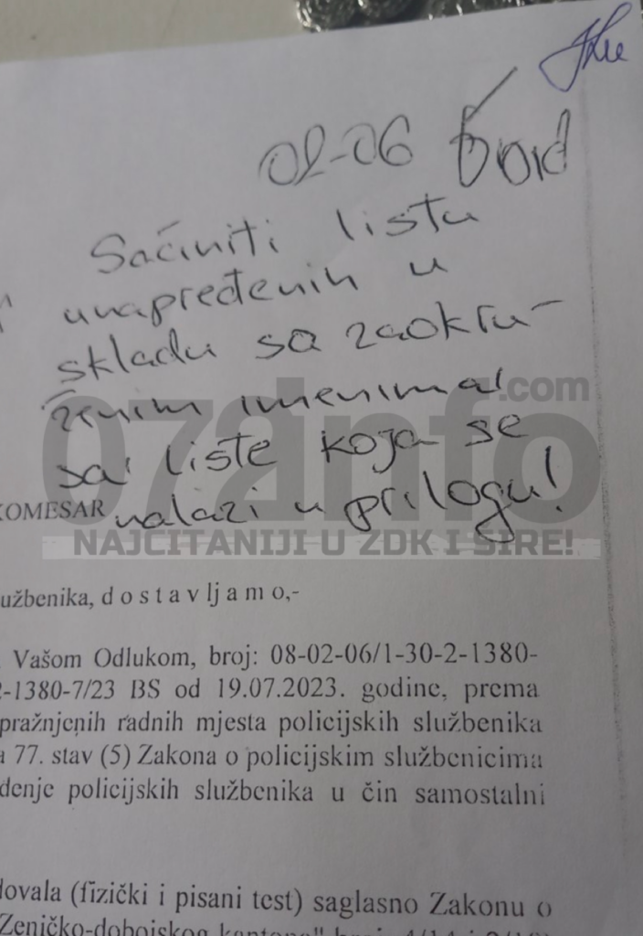 Istovremeno, u zeničkom MUP-u nedavno je proveden interni konkurs za unapređenje policijskih službenika za činove inspektor, viši i samostalni inspektor. Portal “072info” u posjedu je dokumenta na kojem se nalazi uputa Komisiji za provođenje postupka unapređenja, a koja dokazuje kako na internom konkursu neće biti unaprijeđeni oni koji su to uistinu zaslužili nego, kako stoji na uputi, oni koji su zaokruženi.