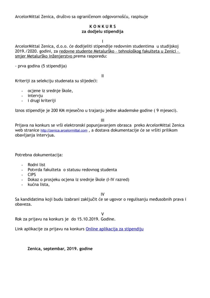 DRAGI STUDENTI, ArcelorMittal Zenica DODJELJUJE STIPENDIJE ZA AKADEMSKU 2019./2020. GODINU