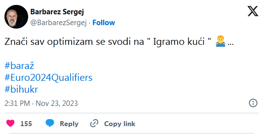– Znači, sav optimizam se svodi na “igramo kući” – poručio je Barbarez.