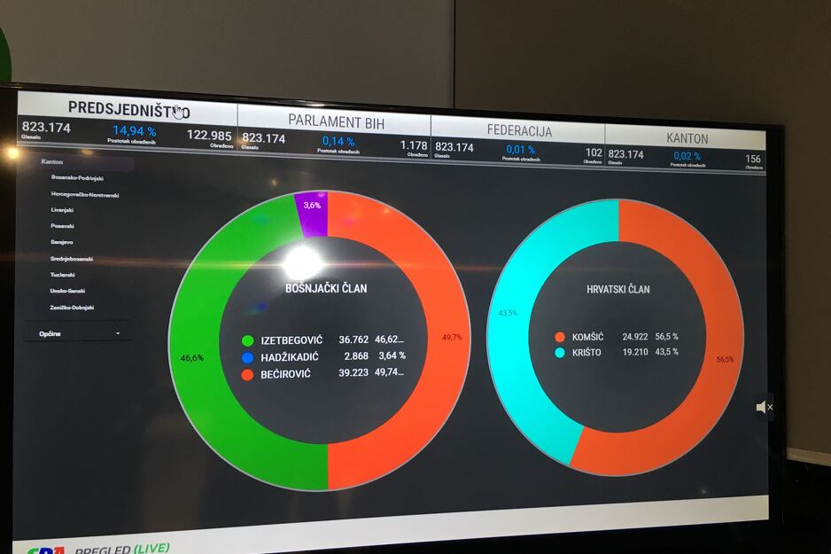 Kada je pitanju član Predsjedništva BiH iz reda hrvatskog naroda, u izbornom štabu SDA podaci govore da Željko Komšić trenutno vodi sa 59,8 posto glasova ili 10.933 prebrojanih glasova dok Borjana Krišto ima 40,2 posto ili 7.361 glasova.