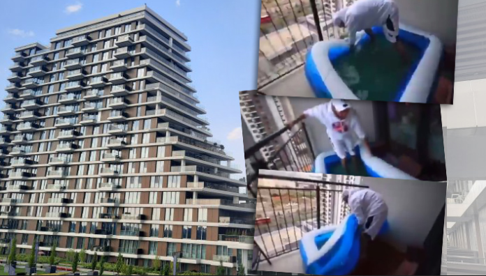 Na njemu se vidi kako momak na terasi stana Beograda na vodi pokušava da isprazni gumeni bazen – sa terase, na ulicu.