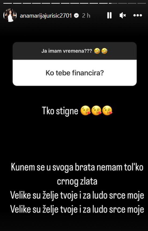 “Kunem se u svoga brata, nemam tol’ko crnog zlata. Velike su želje tvoje i za ludo srce moje”, poručila je Ana Marija znatiželjniku iz inboxa.