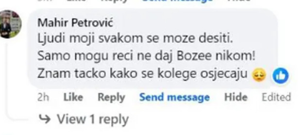“Ljudi moji, svakome se može desiti. Samo mogu reći – ne daj Bože nikome. Znam kako se kolege osjećaju”, napisao je Mahir u komentaru.