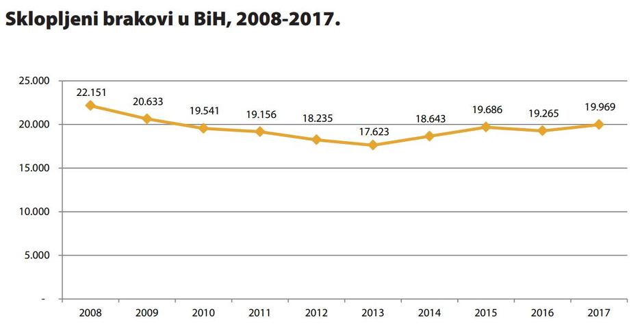 Naime, 2008. godine u Bosni i Hercegovini sklopljen je 22.151 brak, u spomenutom periodu najmanje ih registrovano 2013. godine – 17.623, a 2017. registrovano je 19.969 sklopljenih brakova.