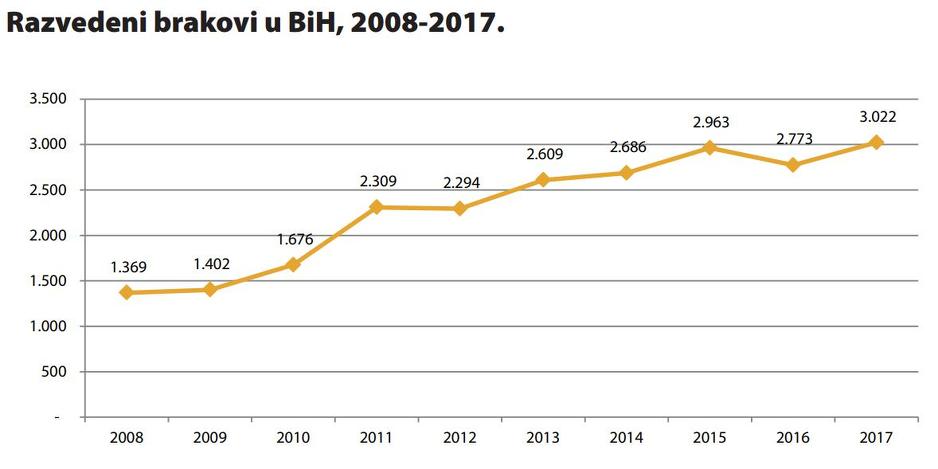 S druge strane, broj razvoda se, nažalost, povećava bez stagniranja, s manjim padom u 2016. godini. Od 2008. do 2017. godine razvedena su 23.103 braka, a ukoliko uzmemo u obzir podatke iz prvih devet mjeseci 2018., taj broj je 24.805.