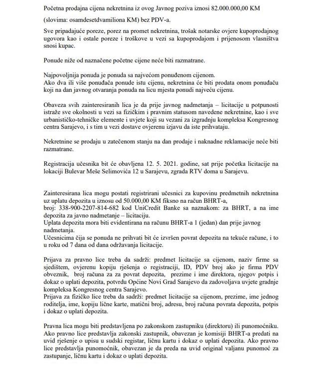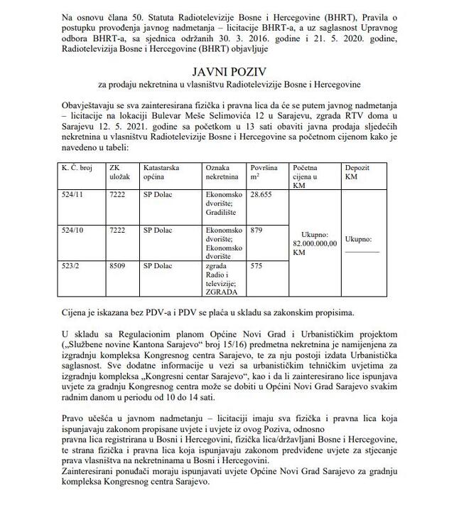 Radiotelevizija BiH (BHRT) objavila je javni poziv za prodaju nekretnina u neposrednoj blizini zgrade državne televizije na Alipašinom Polju u Sarajevu. Na toj lokaciji planirana je gradnja modernog kongresnog centra. Licitacija će biti održana 12. maja.