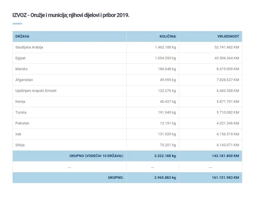 Bosna i Hercegovina je za 10 mjeseci ove godine najviše oružja, municije i vojne opreme, vrijednosti 96,2 miliona KM, izvezla u Saudijsku Arabiju i Egipat.