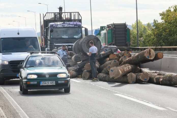 Na vijaduktu u Zalužanima u subotu poslije podne došlo je do saobraćajne nesreće i tom prilikom se prevrnula prikolica sa natovarenim drvenim trupcima.
