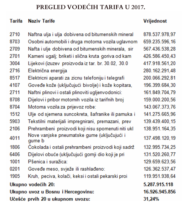 Na vrhu liste proizvoda koje je BiH najviše uvozila u 2017. su naftna ulja i ulja dobivena od bitumenskih minerala za čiju kupovinu je naša zemlja izdvojila 878.537.978 KM. Osobni automobili i druga motorna vozila su na drugom mjestu, a uvezeno ih je u vrijednosti 659.235.596 KM.
