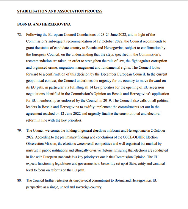 “Slijedom zaključaka Evropskog vijeća od 23. i 24. juna 2022., te u svjetlu nakandne preporuke Komisije od 12. oktobra 2022. Vijeće preporučuje da se dodijeli status zemlje kandidata Bosni i Hercegovini, uz potvrdu od strane Evropskog vijeća, uz razumijevanje da su koraci navedeni u preporuci Komisije poduzeti, u cilju jačanja vladavine prava, borbe protiv korupcije i organiziranog kriminal, upravljanje migracijama i temeljnih prava”, navodi se u dokumentu i dodaje da Vijeće sa nestrpljenjem očekuje potvrdu od strane Evropskog vijeća u decembru.