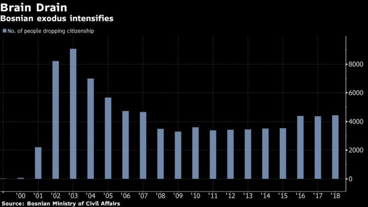 Kao ilustraciju svog teksta, “Bloomberg” je postavio grafikon Ministarstva civilnih poslova BiH u kojem se vidi koliko se godišnje ljudi odrekne državljanstva naše zemlje. Podaci se vode od 2001. godine i iz njih se može vidjeti da je u posljednje tri godine trend odricanja “stabilan” i pokazuje da se između 4 i 5 hiljada ljudi odriče bh. državljanstva.