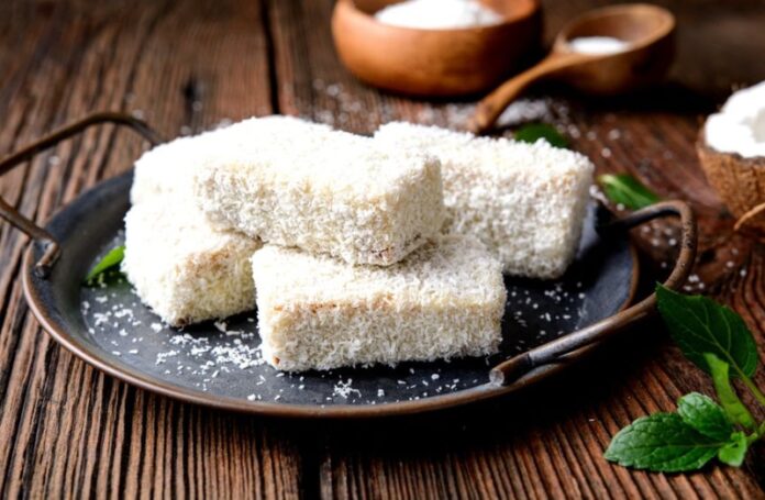 5. Glazura i biskvit moraju se ohladiti prije završne faze. Razrežite biskvit na kocke. Zatim jednu po jednu nabodite na viljušku ili primite kuhinjskom pincetom pa namočite u glazuru, zatim uvaljajte u kokos i odložite na pleh. Ponavljajte postupak dok ne potrošite sav biskvit.