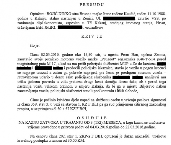 Prema presudi Općinskog suda u Zenici i stavu Tužilaštva ZDK, dovoljno je da priznate krivicu i biće vam oprošteno što ste teško povrijedili policajca, pobjegli, odbacili drogu iz vozila. Stranke i tajkuni su za ove pravosudne institicije važniji od zaštite čestitih policajaca