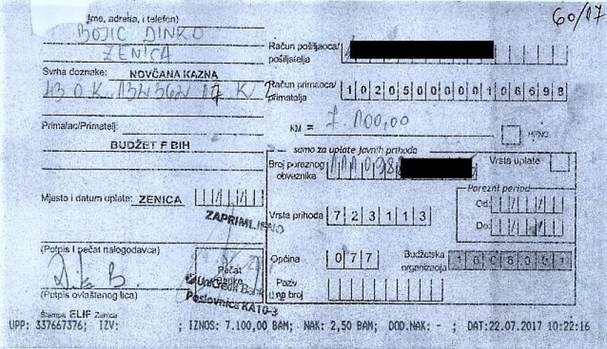 Tužilaštvo, naravno, ne ulaže žalbu. Dva mjeseca kasnije ista sutkinja odobrava zamjenu zatvorske kazne novčanom. Dinko Bojić potom uplaćuje 7100 maraka. (vidi galeriju) Slučaj je završen. Poruka je jasna: policajce možete napadati pa i teško povrijediti, ali ne brinite ako imate novca i dobru „zaleđinu“.