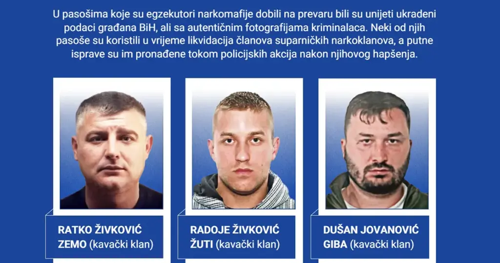 Najmanje 60 članova Kavačkog, Škaljarskog, Šarićevog i klana „Amerika“ kao i drugih kriminalnih organizacija iz Srbije, Crne Gore, Bugarske, Hrvatske i Slovenije putovalo je širom svijeta sa pasošima BiH. Prema podacima koje su prikupili novinari CIN-a, putne isprave su im izdavale policije i vladine službe u: Sarajevu, Banjoj Luci, Zvorniku, Brčkom, Mostaru, Gradišci i Goraždu od 2013. do 2022. godine. U pasošima, ličnim kartama i vozačkim dozvolama koje su dobili na prevaru bili su unijeti ukradeni podaci bh. građana, ali sa autentičnim fotografijama kriminalaca. Neki od njih pasoše su koristili u akcijama likvidacija članova suparničkih narkoklanova, a putne isprave su im pronađene tokom policijskih akcija nakon njihovog hapšenja.