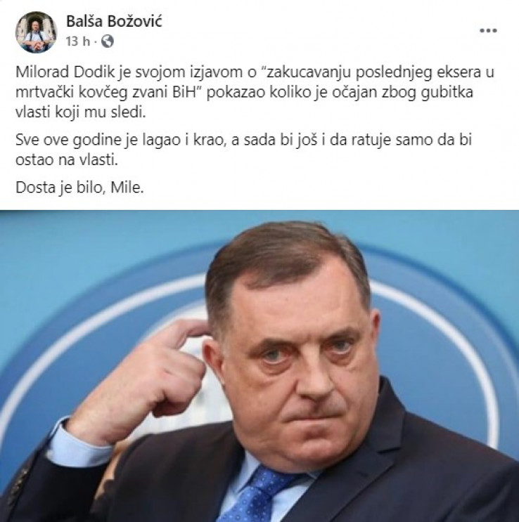 Balša Božović, srbijanski politički aktivist i član Demokratske stranke, prokomentarisao je posljednje izjave Milorada Dodika, člana Predsjedništva BiH, nakon odluke visokog predstavnika Vakentina Incka (Inzko) da zabrani negiranje genocida i drugih ratnih zločina.
