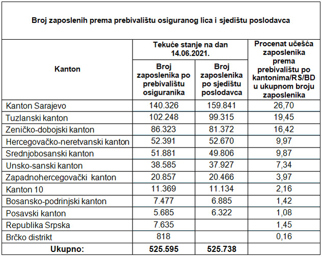 Broj zaposlenih u Federaciji BiH prema prebivalištu zaposlenika na dan 14. juni 2021. godine iznosio je 525.595.