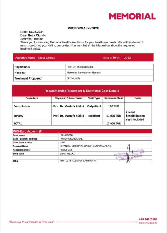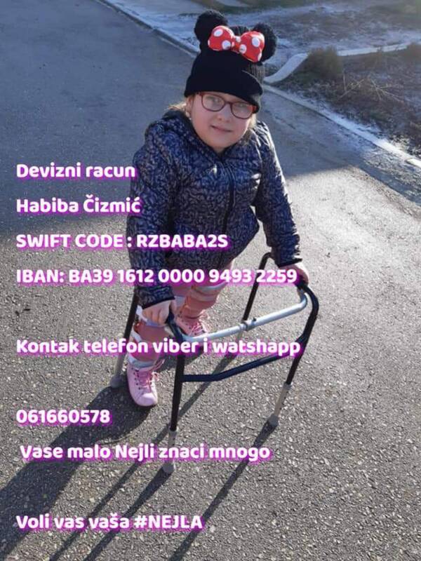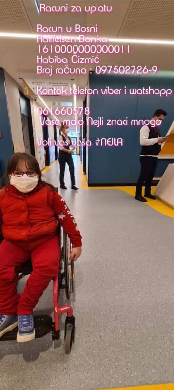 Nejli je deset godina još nikad nije prohodala obišli, smo po Bosne dosta doktora te u Turskoj, Ljubljani i sad na Memeorijal su nam dali najveće šanse za uspjeh. Operacija košta 17.000 eura plus troškovi.