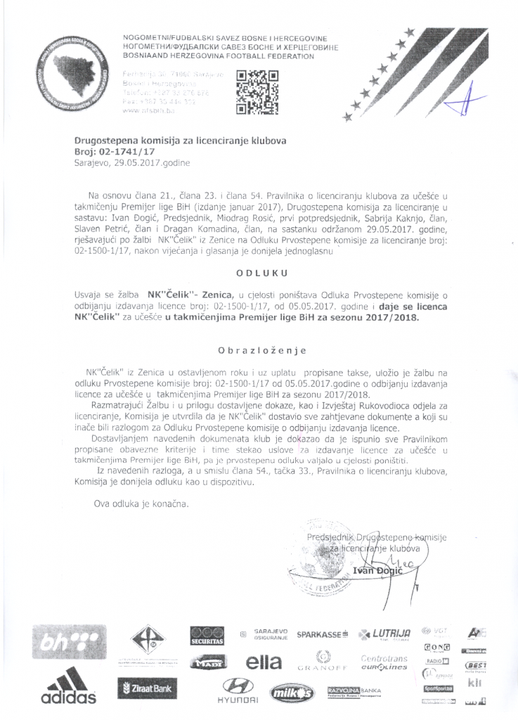 Odlukom Drugostepene komisije za licenciranje Nogometnog/fudbalskog saveza Bosne i Hercegovine Nogometni klub Čelik dobio je licencu za takmičenje u BH Telecom Premijer ligi u sezoni 2017/18. Nakon što je ekipa izborila ostanak na terenu, sada su otklonjene i sve administrativne prepreke i Čelik se naredne sezone ponovo takmiči u društvu najboljih!