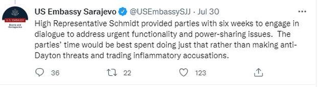 Iako Schmidt, barem javno nije ostavio nikakav rok, Ambasada SAD-a ne nedavno istakla da je političkim akterima dato šest sedmica za mogućnost dogovora, što korespondira sa sredinom septembra.