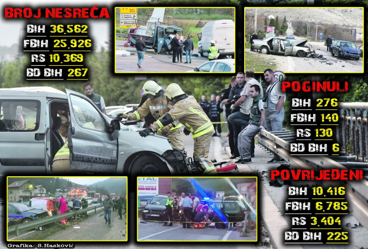 Iako je, prema ponuđenim podacima, došlo do smanjenja saobraćajnih nesreća, njihov broj je i dalje velik. Najviše nesreća prošle godine evidentirano je u Federaciji BiH, njih 25.926. Poginulo je 140 osoba, dok ih je 6.785 povrijeđeno. Najviše su smrtno stradali vozači, njih 81, zatim pješaci (32) te putnici (27).
