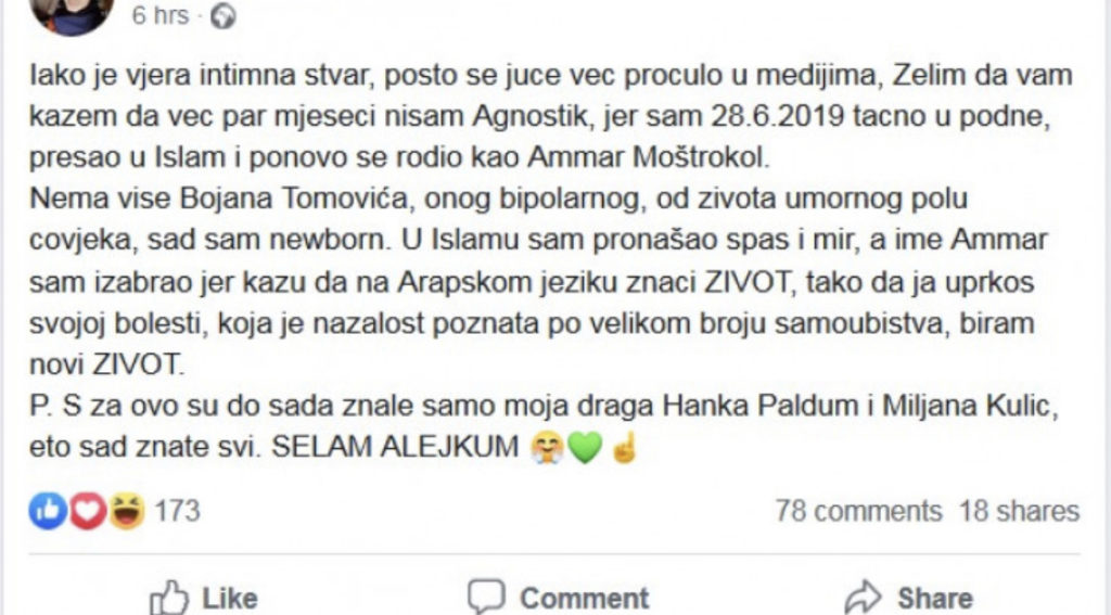– Iako je vjera intimna stvar, pošto se jučer već pročulo u medijima, želim da vam kažem da već par mjeseci nisam agnostik jer sam 28. 6. 2019. godine tačno u podne, prešao na islam i ponovo se rodio kao Ammar Moštrokol. Nema više Bojana Tomovića, onog bipolarnog, od života umornog polučovjeka, sad sam newborn – napisao je pjevač.